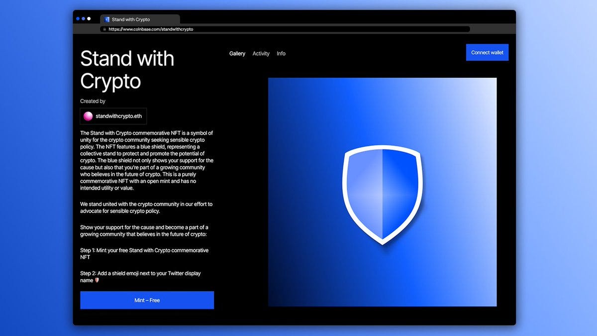 “Stand with Crypto”纪念NFT是完全纪念性质的,具有开放的铸造和无意义的实用价值。