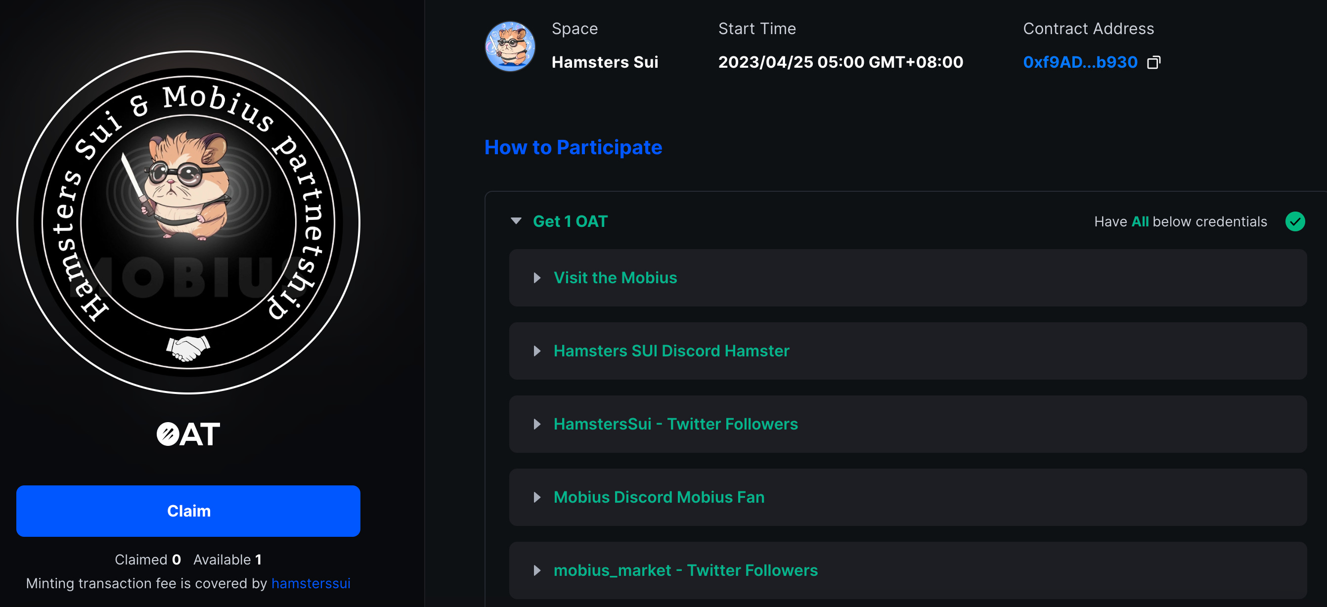 5、Hamsters Sui x Mobius partnership - OAT领取